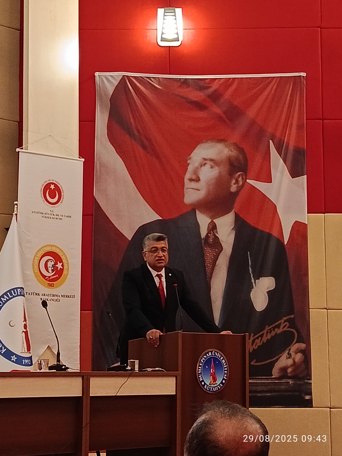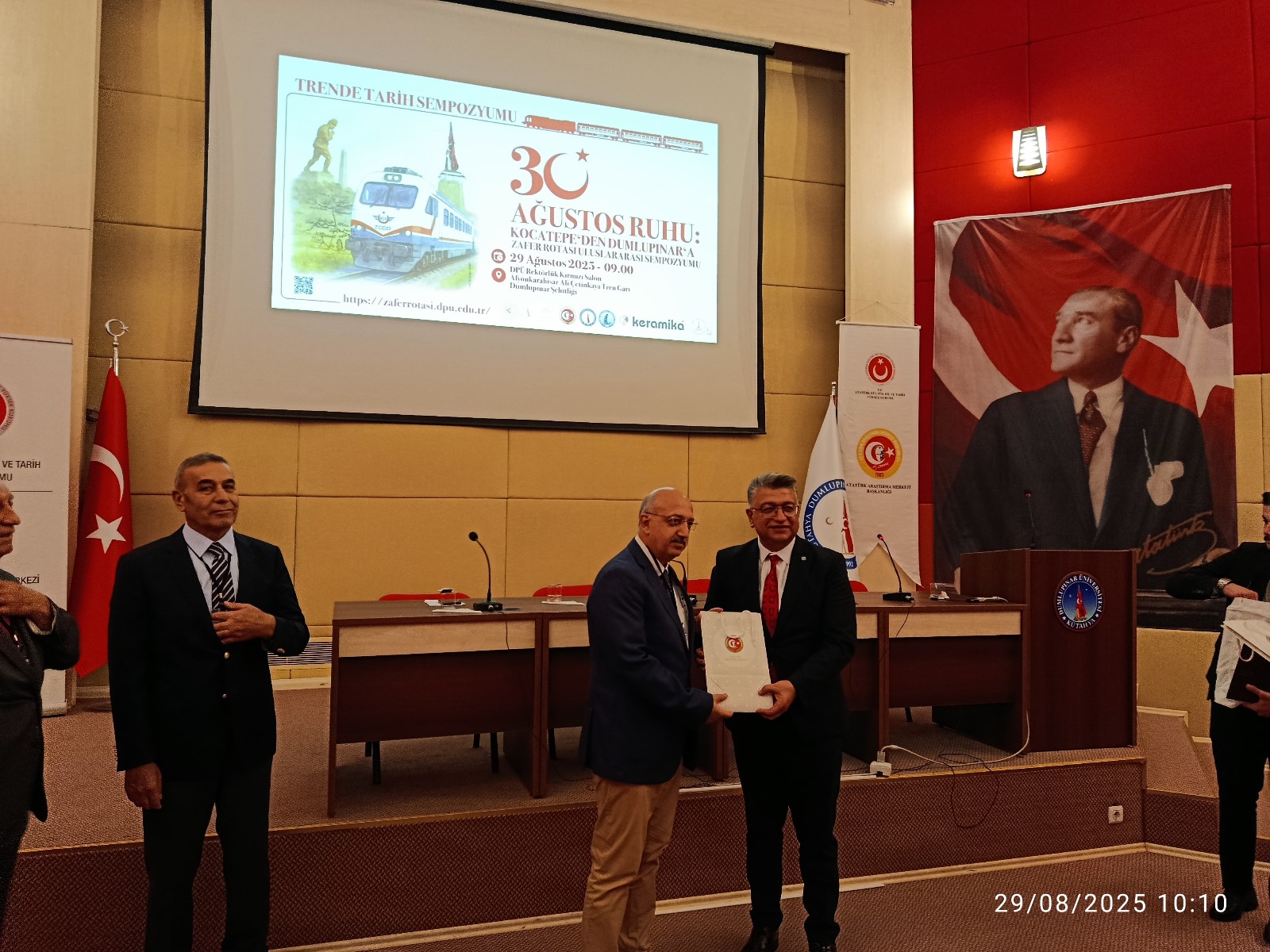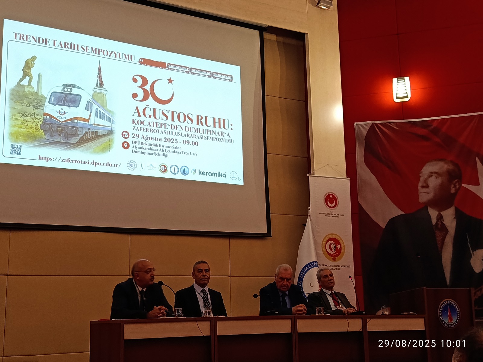 Kurumumuz tarafından desteklenen “30 Ağustos Ruhu: Kocatepe’den Dumlupınar’a Zafer Rotası Uluslararası Sempozyumu”, 29 Ağustos 2025 tarihinde Kütahya Dumlupınar Üniversitesi Rektörlüğü Kırmızı Salon ’da yapılan açılış töreni ile başladı. ATAM tanıtım filmi ve Kurumumuz tarafından hazırlanan “Büyük Taarruz ve Dumlupınar Başkumandan Meydan Muharebesi” videosu gösterildikten sonra Rektör Prof. Dr. Süleyman Kızıltoprak açış konuşmalarını yaptı. Kızıltoprak’ın konuşmalarından sonra Prof. Dr. Vahdettin Engin, Prof. Dr. Ali Sarıkoyuncu, ATAM Bilim Kurulu Asli Üyesi Prof. Dr. Mesut Çapa ile Atam Bilim Kurulu Asli Üyesi Prof. Dr. Ali Satan’ın, Büyük Taarruz ve Millî Mücadele hakkında yaptıkları kısa bilgilendirmeden sonra ATAM Yayınları arasında yer alan “Millî Mücadele’de Manisa-Uşak-Afyonkarahisar-Konya Hattı” eseri ve ATAM Dergisi’nin 9., 24., 29. ve 58. sayıları protokole ve katılımcılara hediye edildi. Akabinde, sempozyuma özel olarak hazırlanan trendeki sunumların icrası için Afyonkarahisar Ali Çetinkaya Garı’na hareket edildi.