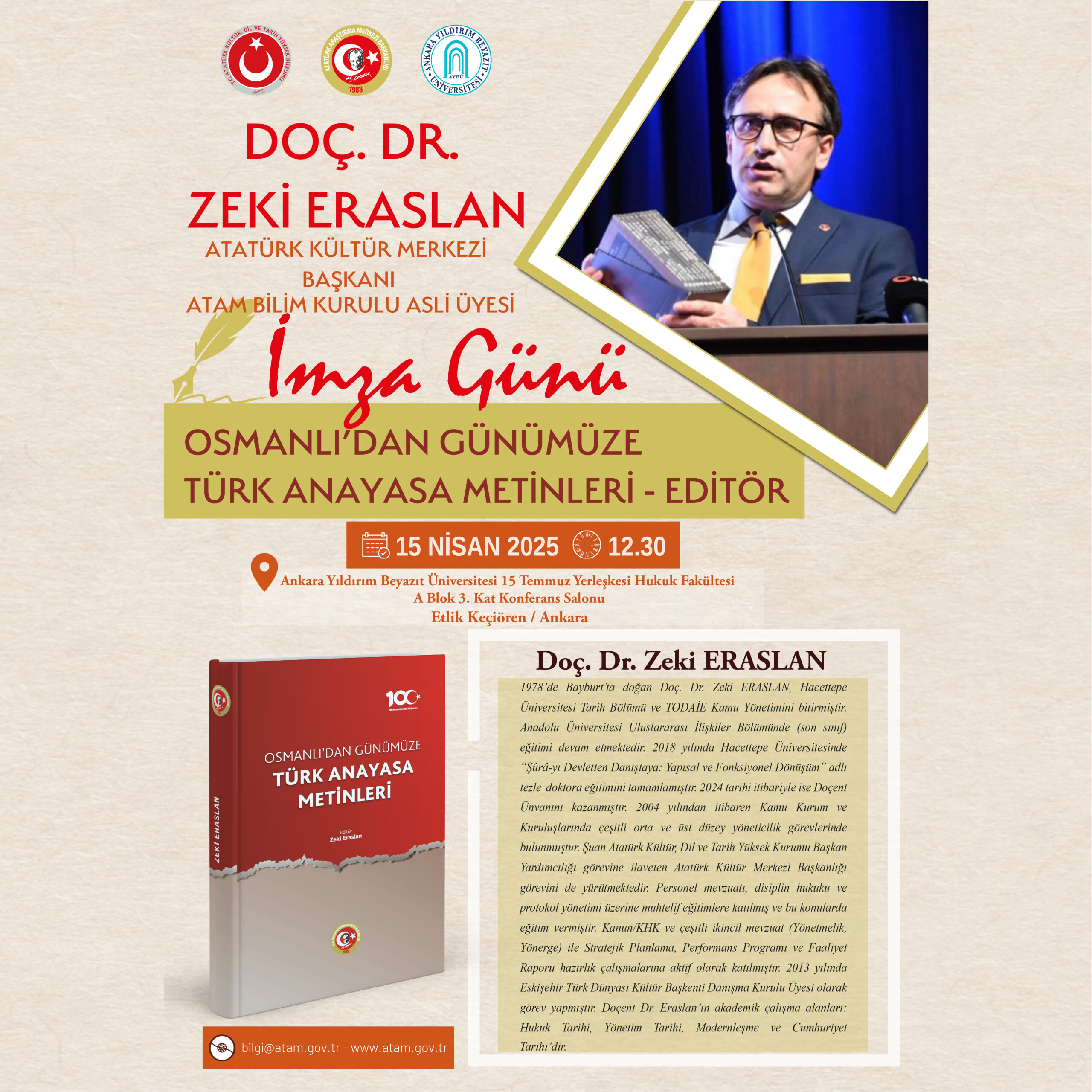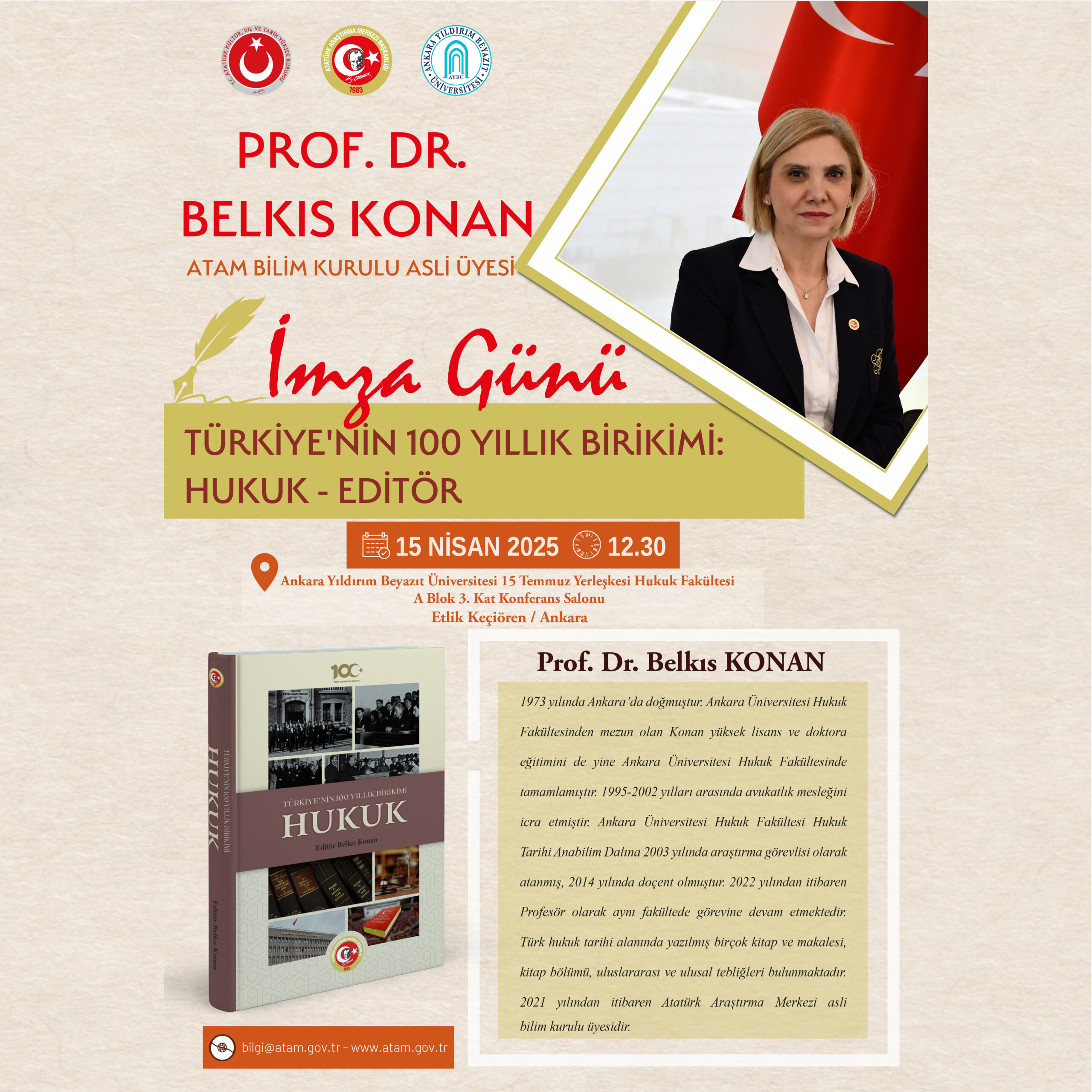 Atatürk Araştırma Merkezi tarafından 15 Nisan 2025 Salı günü saat 11.00’de, Ankara Yıldırım Beyazıt Üniversitesi ev sahipliğinde “Osmanlı’dan Günümüze Anayasal Gelişmeler” Paneli düzenlenecektir. Panel sonrasında, panelistlerimizden “Türkiye’nin 100 Yıllık Birikimi- Hukuk” kitabının editörü Prof. Dr. Belkıs KONAN ve “Osmanlı’dan Günümüze Türk Anayasa Metinleri” kitabının editörü Doç. Dr. Zeki ERASLAN tarafından imza töreni gerçekleştirilecektir.