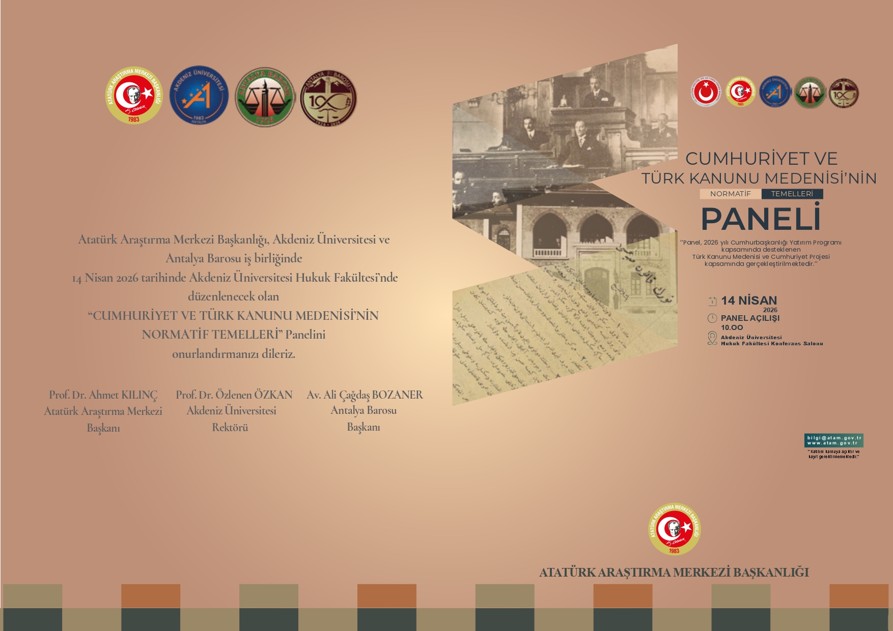 Atatürk Araştırma Merkezi Başkanlığı, Akdeniz Üniversitesi ve Antalya Barosu iş birliğiyle “Cumhuriyet ve Türk Kanunu Medenisi’nin Normatif Temelleri Paneli” düzenlenecektir.