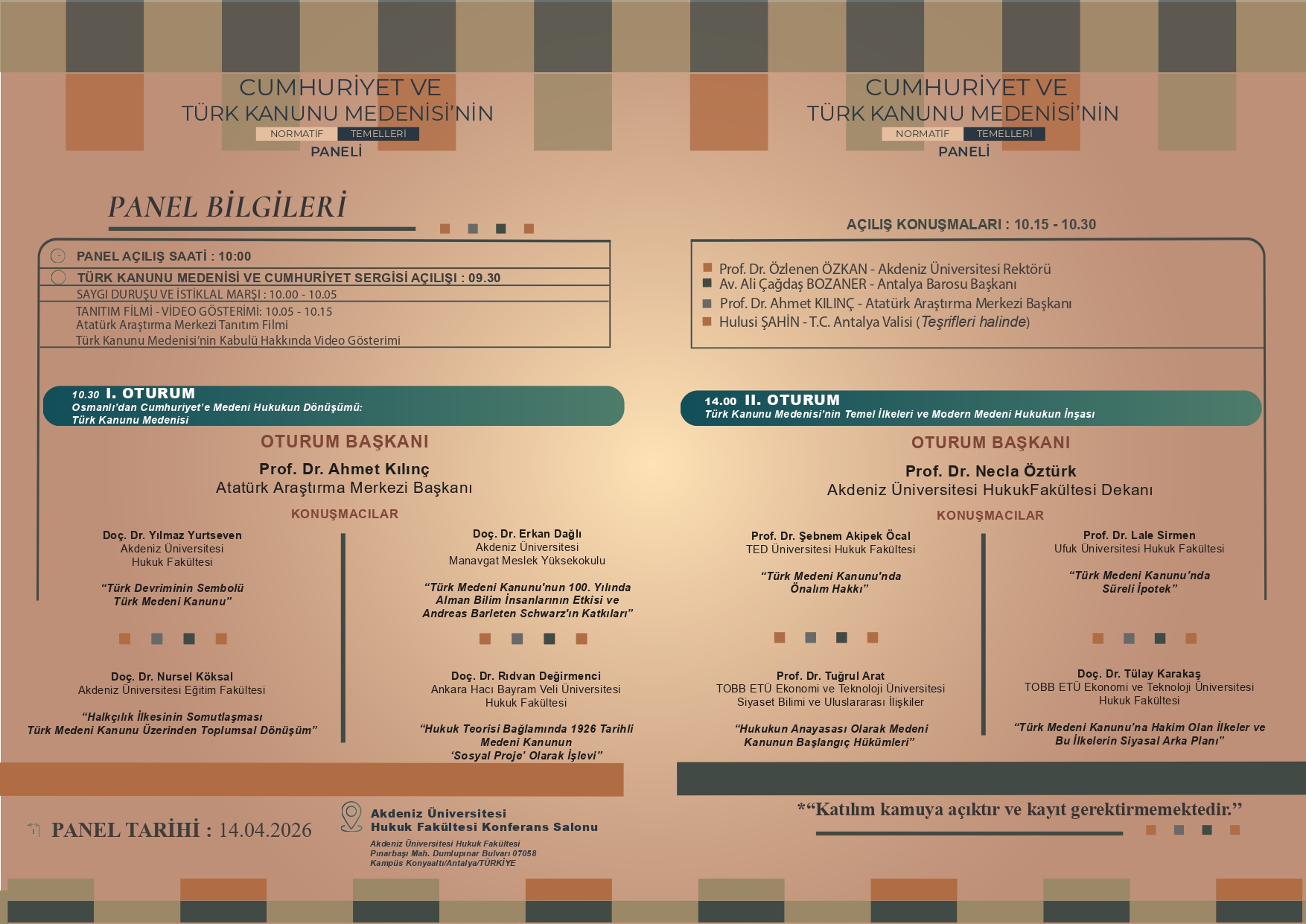 14 Nisan 2026 tarihinde Akdeniz Üniversitesi Hukuk Fakültesi Konferans Salonu’nda gerçekleştirilecek panelde; Türk Kanunu Medenisi, Türk hukuk tarihi, hukuk felsefesi, medeni hukuk ve Cumhuriyet tarihi perspektifinden ele alınacaktır.
