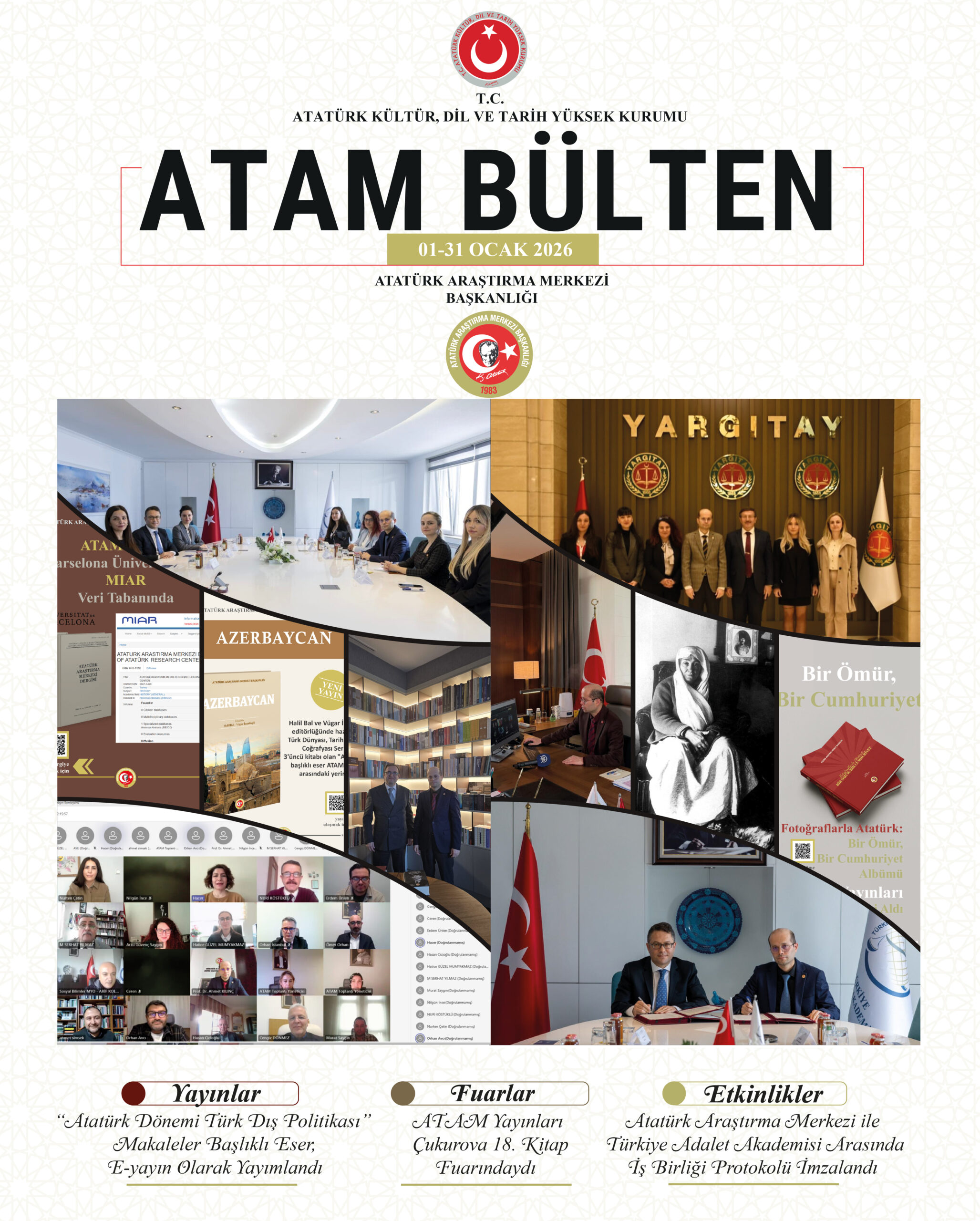 Atatürk Araştırma Merkezi tarafından hazırlanan ATAM Bülten’in Ocak Sayısı yayımlanmıştır. Kurumumuzca düzenlenen etkinlikler, gerçekleştirilen projeler ve yayımlanan eserlerle ilgili bültene erişim sağlamak için tıklayınız.