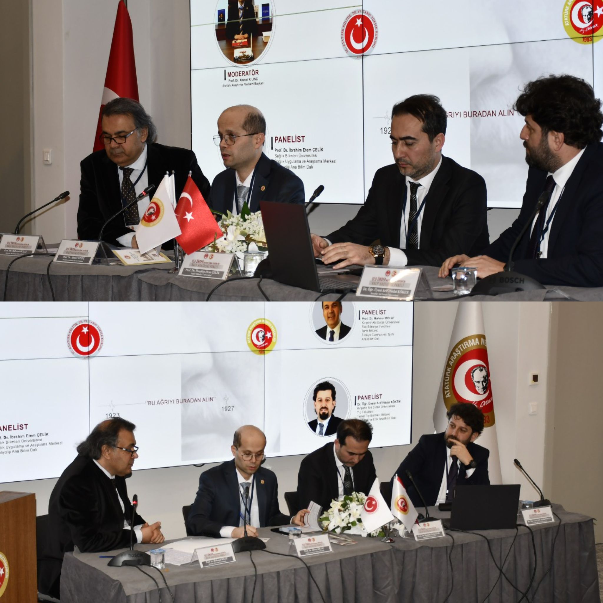 Prof. Dr. İbrahim Etem Çelik, konuyu kardiyoloji perspektifinden değerlendirirken; Dr. Öğr. Üyesi Arif Hüdai Köken ise tıp tarihi açısından ele aldı. Sunumlarda, Atatürk’ün yaşadığı göğüs ağrılarının dönemin imkânlarıyla “anjina pektoris” olarak değerlendirildiği, modern tıp açısından ise akut koroner sendrom ile ilişkilendirilebileceği belirtildi. Ayrıca o dönemde EKG ve ileri tanı yöntemlerinin yaygın olmamasının teşhis sürecini sınırladığı ifade edildi.