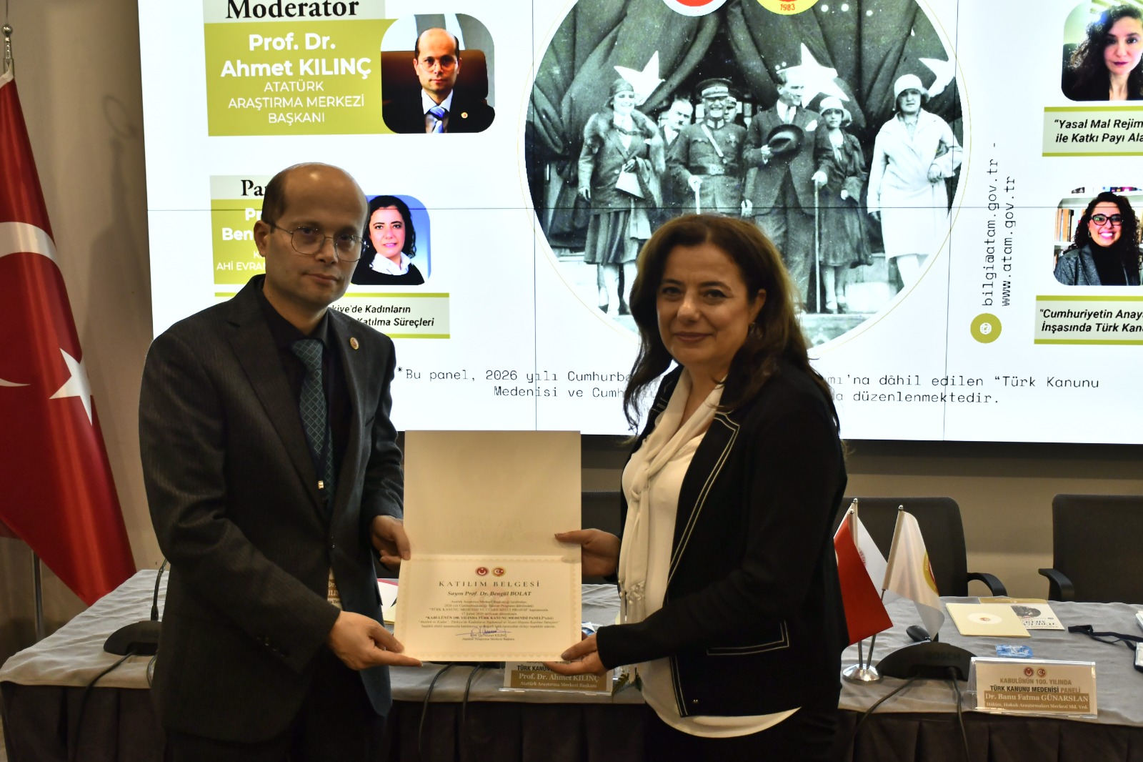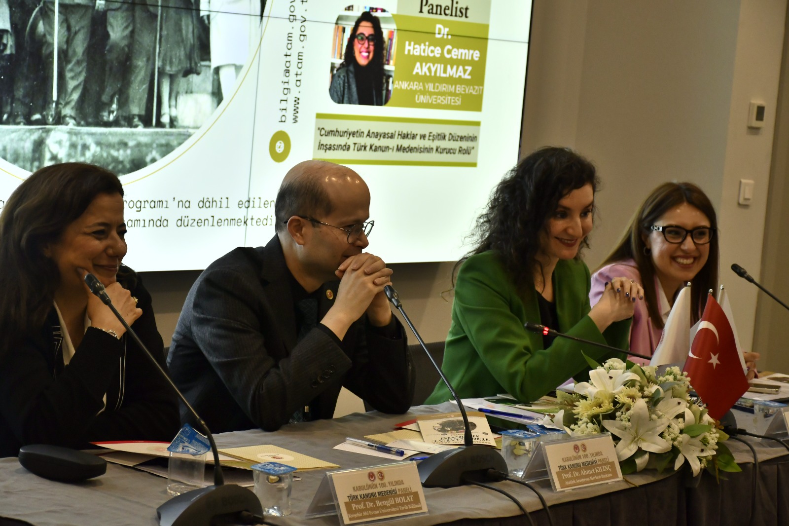 Prof. Dr. Ahmet Kılınç’ın moderatörlüğünde icra edilen panelde; Prof. Dr. Bengül Bolat “Atatürk ve Kadın: Türkiye’de Kadınların Toplumsal ve Siyasi Hayata Katılma Süreçleri” başlıklı sunumunda Türk Medeni Kanunu’nun kadın hakları bakımından dönüştürücü rolünü ele aldı.
