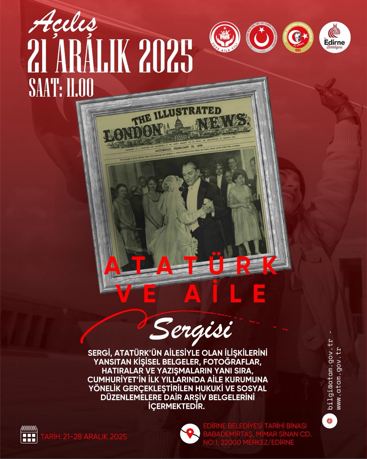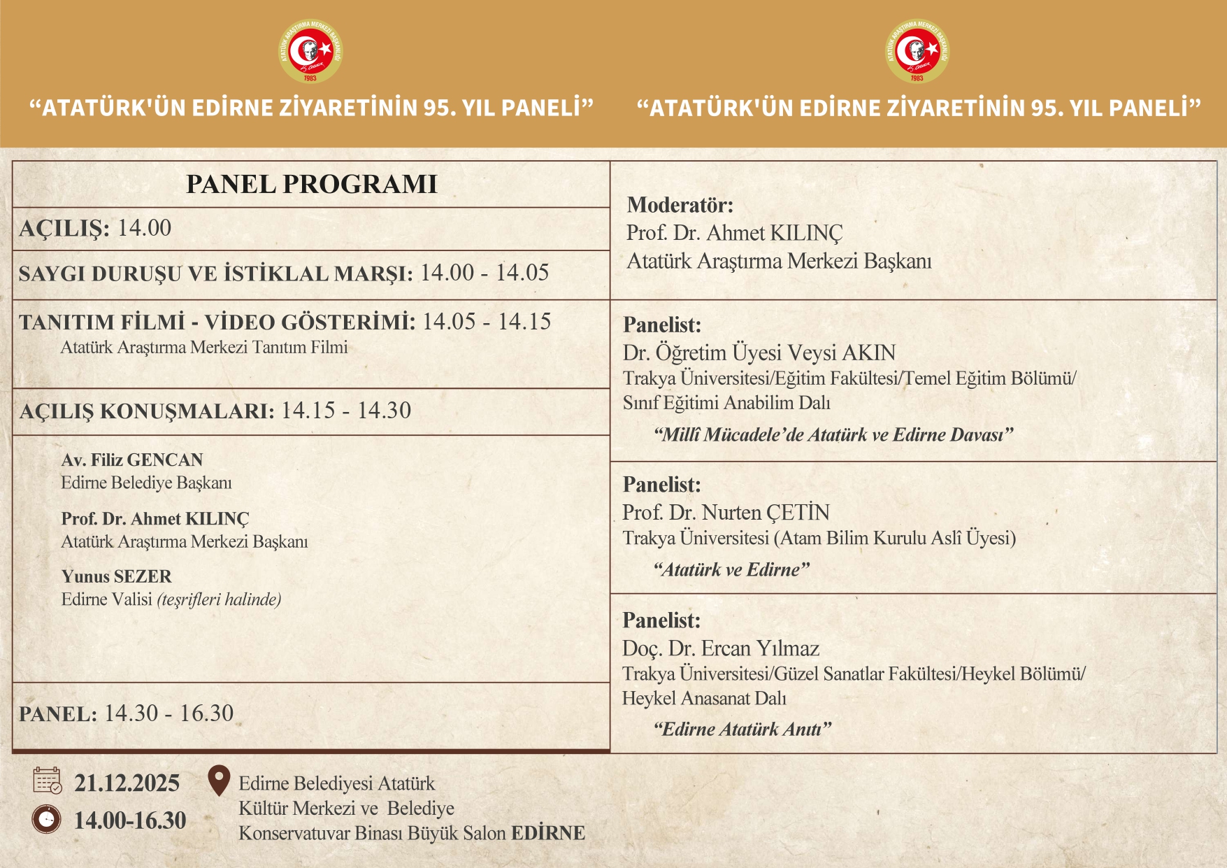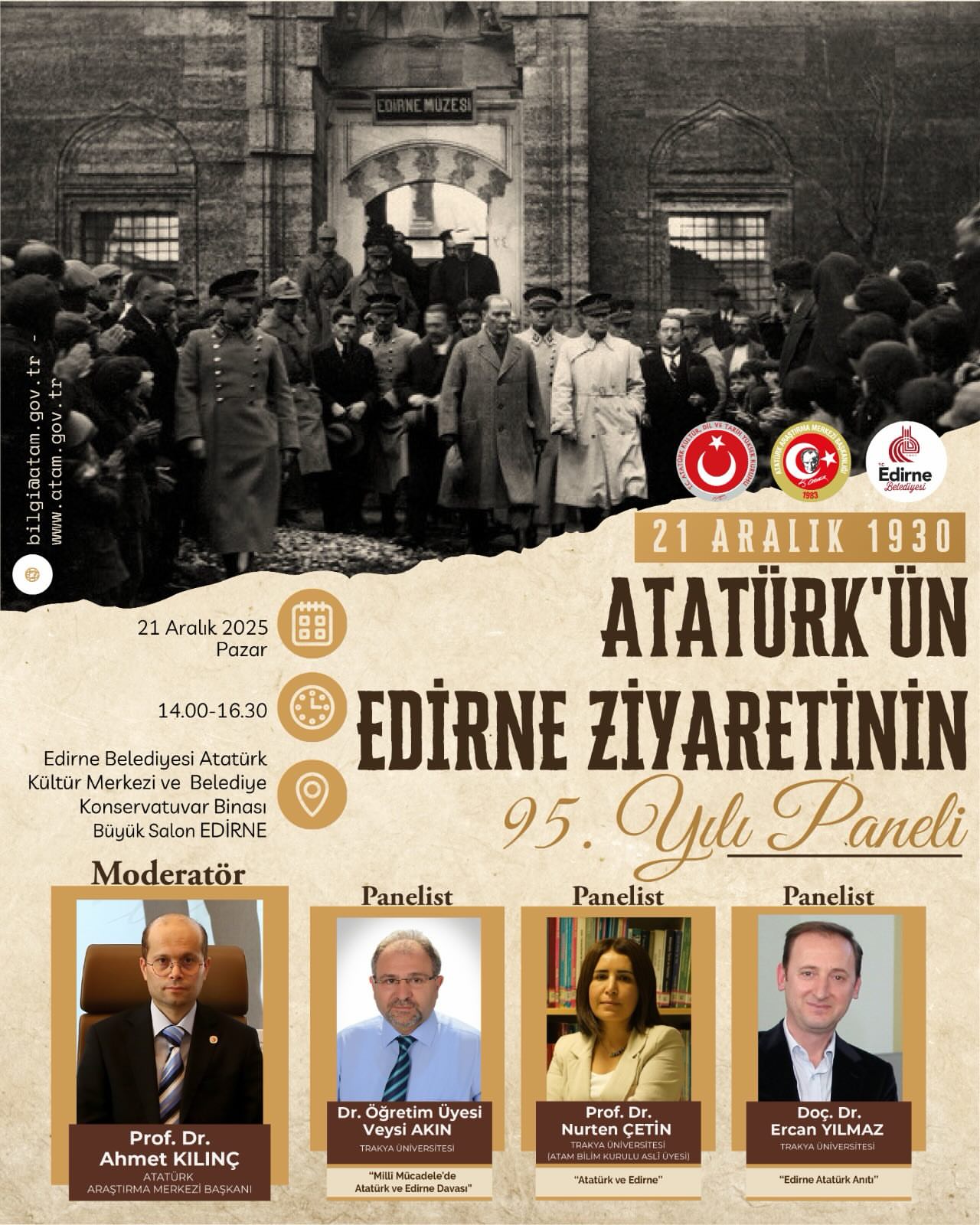 “Atatürk’ün Edirne Ziyaretinin 95. Yılı Paneli”, 21 Aralık 2025 Pazar günü saat 14.00-16.30 saatleri arasında, Edirne Belediyesi Atatürk Kültür Merkezi ve Belediye Konservatuvar Binası Büyük Salonu’nda gerçekleştirilecektir. Panel, Atatürk Araştırma Merkezi Başkanı Prof. Dr. Ahmet Kılınç’ın moderatörlüğünde yapılacak olup Prof. Dr. Nurten Çetin , Dr. Öğr. Üyesi Veysi Akın ve Doç. Ercan Yılmaz panelist olarak programa katkı sunacaktır. Söz konusu panel öncesinde ise, Atatürk Araştırma Merkezi tarafından hazırlanan ve Atatürk’ün ailesiyle olan ilişkilerini; kişisel belgeler, fotoğraflar, hatıralar ve yazışmalar ışığında ele alan “Atatürk ve Aile Sergisi”nin beşincisi ziyarete açılacaktır. Sergide ayrıca, Cumhuriyet’in ilk yıllarında aile kurumuna yönelik gerçekleştirilen hukuki ve sosyal düzenlemelere ilişkin arşiv belgelerine de yer verilecektir. Sergi, 21-28 Aralık 2025 tarihleri arasında Edirne Belediyesi Tarihi Binasında ziyaret edilebilecektir. Tüm ilgililer, bu anlamlı programa davetlidir.