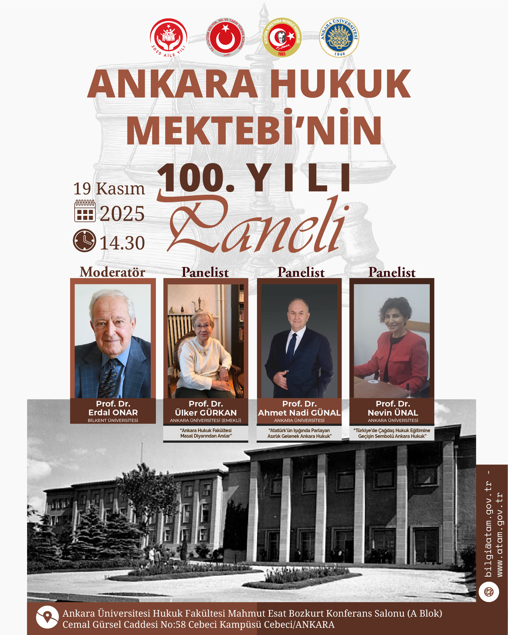Saat 15.00’te başlayan panel, Moderatör Prof. Dr. Erdal Onar tarafından açıldı. Ardından Prof. Dr. Nevin Ünal “Türkiye’de Çağdaş Hukuk Eğitimine Geçişin Sembolü Ankara Hukuk”, Prof. Dr. Ahmet Nadi Günal “Atatürk’ün Işığında Parlayan Asırlık Gelenek Ankara Hukuk”, Prof. Dr. Ülker Gürkan “Ankara Hukuk Fakültesi Masal Diyarından Anılar” başlıklı sunumlarını gerçekleştirdiler.