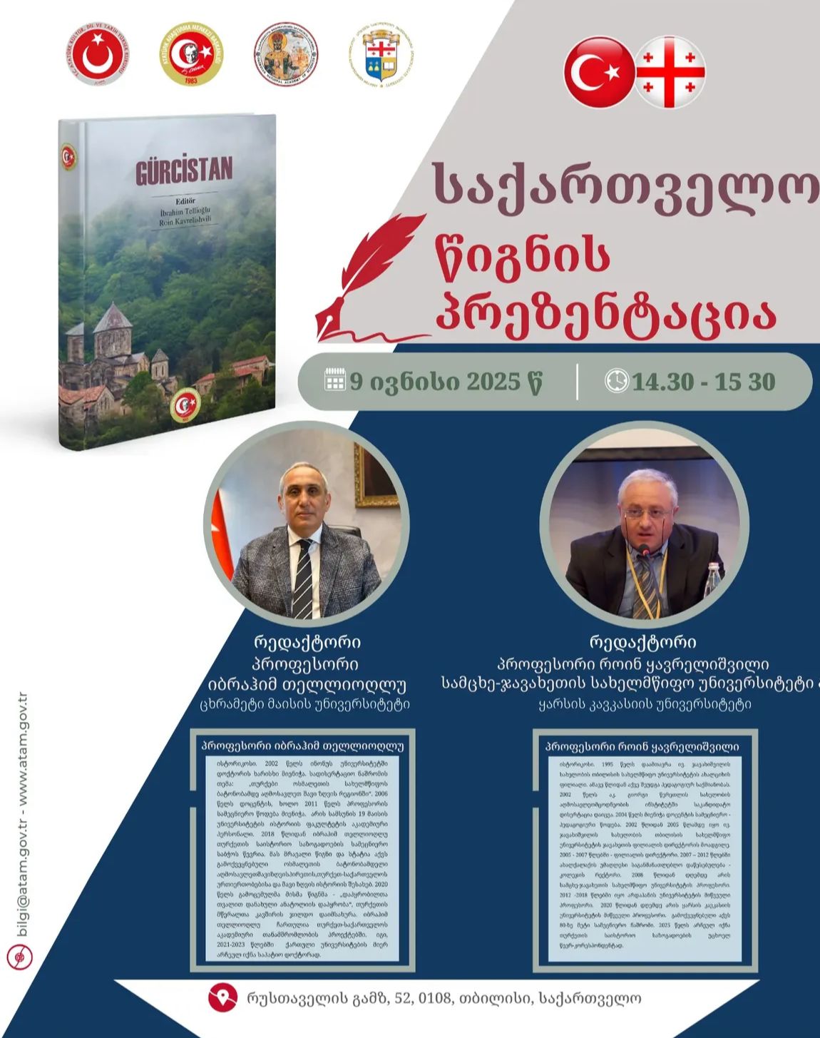 “Türk Dünyası, Tarih ve Kültür Coğrafyası Kitap Serisi”nin “Ukrayna” dan sonra ikinci kitabı olarak ATAM tarafından yayımlanan “Gürcistan” başlıklı eserin tanıtımı amacıyla 9 Temmuz 2025 tarihinde Gürcistan Ulusal Bilimler Akademisi ev sahipliğinde, Sokhumi Devlet Üniversitesi katkılarıyla imza töreni düzenlenecektir. Gürcistan tarihini kapsamlı bir şekilde ele alan eserin imza töreninde kitabın editörleri Prof. Dr. İbrahim Tellioğlu ve Prof. Dr. Roin Kavrelishvili’nin yanı sıra yazarları ve Gürcüce makaleleri Türkçeye çeviren Dr. Öğretim Üyesi Maya Meskhidze de yer alacaktır.